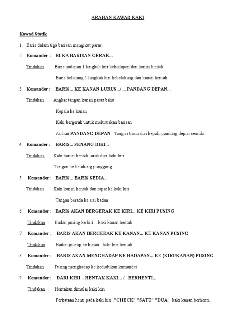 Kawad kaki merupakan satu aktiviti yang menggunakan pergerakan asas perbarisan dengan betul dan serentak kaki mempunyai. View ASAS KAWAD KAKIpptx from DDWW 060055 at Kolej Yayasan Pelajaran Johor. Download view arahan kawad kaki as pdf for free.